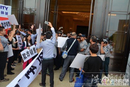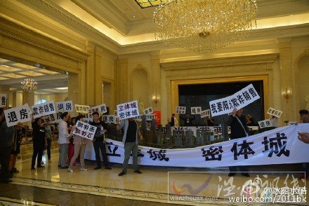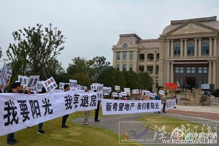 据悉,这些三江立体城房的业主拿着条幅抗议新希望地产楼盘建设和当初宣传的不一样,并要求退房。据其中一位业主表示,房子之间的间距太小,楼层低的房子基本一天照不到什么太阳。他们表示房子设计跟沙盘模型差太多,让他们接受不了,所以要求退房。