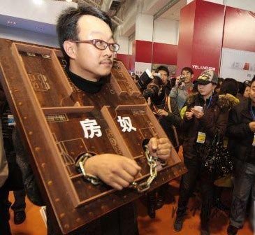 行为艺术家扮“房奴”抗议房产商。 2007年12月11日,第九届中国住交会在北京开幕。行为艺术家梁克刚的头和双手被“房奴”的镣铐紧紧锁住,他频频到各大房地产开发商的展台“抗议”,表达自己的行为艺术。当行为艺术结束,打开“房奴”镣铐后,该行为艺术家终于露出笑容。