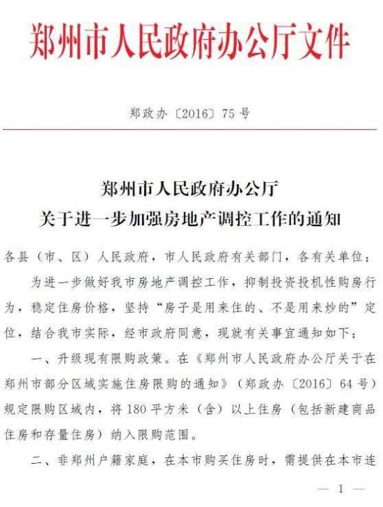 2016年10月1日晚间,郑州市政办公厅发布《关于在郑州市部分区域实施住房限购的通知》规定,在市内五区、航空港区、郑东新区、经济开发区、高新区内,对以下两种类型家庭,限制向其销售180平方米以下的住房: 拥有2套及以上住房的本市户籍居民家庭; 拥有1套及以上住房的非本市户籍居民家庭。