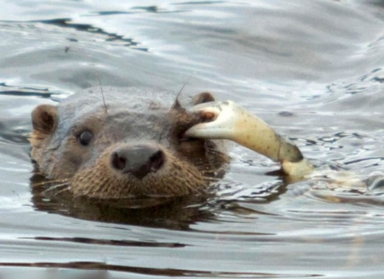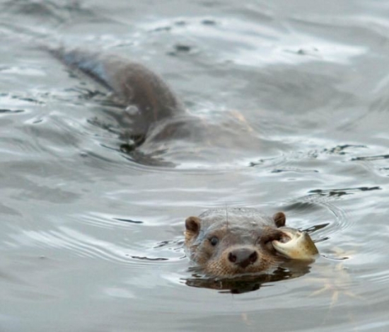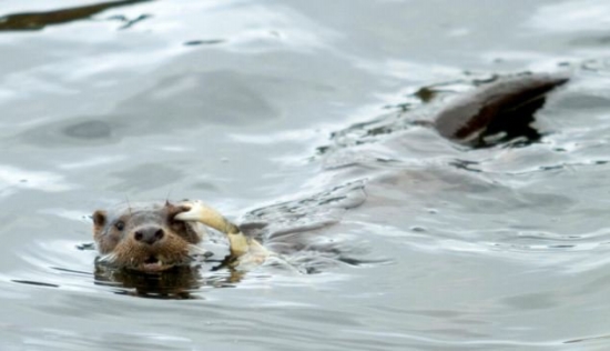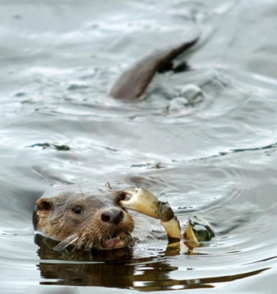 但是,水獭接着在我右前边俯冲下去,再次出现时,它已经离我有将近两米远了。随后,它又俯冲,又消失。我等了一会儿,但是它们再也没有出现,我不知道水獭和螃蟹到底怎样了。