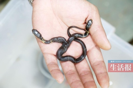 2015年8月7日,南宁市动物园的饲养员李科其从黄先生手中接过这条刚出生不久的双头眼镜蛇。小蛇学名叫中华眼镜蛇,别名舟山眼镜蛇。孵化出来已经10多天,已经蜕了一次皮。饲养员李科其说:“这条双头蛇已经入园两天,仍旧不吃不喝。”小蛇身体状况目前还可以,但双头蛇不吃不喝,能不能养活还难说。