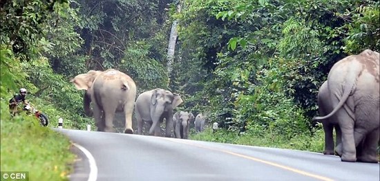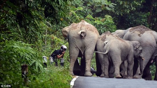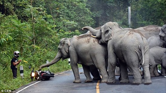 摩托遭大象围攻:哥们双手合十,应该是在祈祷