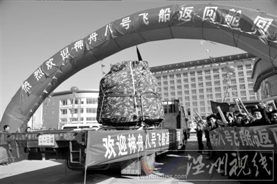 据新华社电神舟八号返回舱昨天运抵北京,神八飞船返回舱主着陆场区指挥部正式向飞船研制单位中国空间技术研究院交接返回舱。
