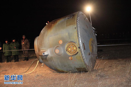 昨天,神舟八号飞船返回舱运抵北京航天城。新华社发