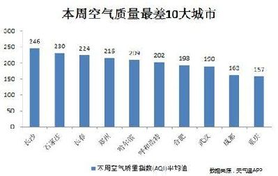 上周,也就是三月份第一周空气质量最差10个城市为:长沙、石家庄、长春、郑州、哈尔滨、呼和浩特、合肥、武汉、成都、重庆。