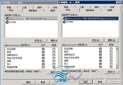 磁盘都使用NTFS格式,如果是FAT32,请转换。命令格式如:convert c:/fs:ntfs(命令默认是C盘,如果是别的分区,请修改盘符)对根目录的权限值保留administrator、system完全权限,如图所示: