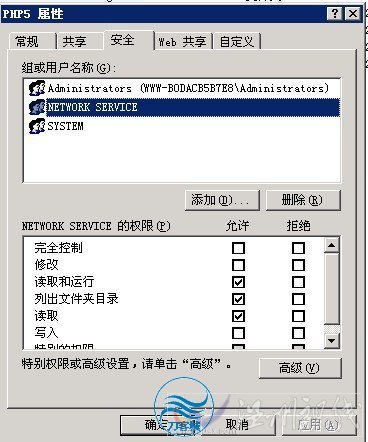 PHP使用network service这个用户组启动的,所以在PHP的安装目录我们需要给他权限,如图所示: