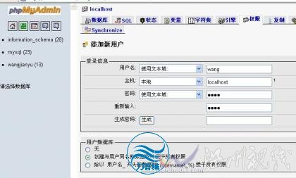 安装好MySQL和phpmyadmin后使用root账户登录,修改root为强密码,最好是数字+大写+小写,如果记得住特殊符号也行。然后点权限,添加新用户新建一个用户,创建与用户同名的数据库并授予所有权限,不给予特殊权限。网站连接MySQL的用户就使用这个新建的,千万不要用root!如图所示: