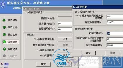 攻击的原理就不说了,搜索引擎搜索一下就知道了,一般的CC攻击都是WEB动态页面发起的,而且会在短时间新建很多TCP端口连接,根据这个特征,我们可以安装一个DDOS防火墙,设置规则,我使用的是冰盾,如图所示是我设置的防护CC攻击规则。