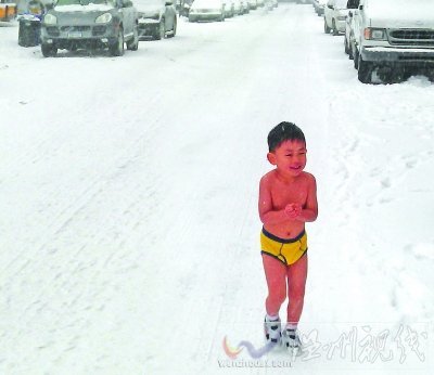 记者昨天接到爆料后上网搜索了这段视频,发现土豆、酷6网上都有,还有众多网友转发在微博里。这段视频留言称,在中国北京时间除夕夜的21:30,美国纽约时间早晨8:30,在父亲与之沟通并经过三十分钟的热身慢跑后,这个4岁的小男孩脱掉自己的内外衣裤,仅穿一条嫩黄色的小短裤和运动鞋,全裸快速地跑入美国纽约法拉盛暴雪肆虐的大街,而当天清晨的室外最低气温达-13℃,大街上几乎看不到一个人,只有他在足足有8英寸厚的雪地里进行晨跑。记者点击视频看到,跑步大约持续了5分多钟,开始的时候,小家伙可能是有点冷,一边追着镜头跑,一边带着点哭腔跟爸爸要“抱抱”,不想再跑了,很快孩子的头上都挂满了雪花,可最后还是在父亲的鼓励下,勇敢地在雪地上裸身做了个俯卧撑才结束,身体上沾满了洁白的雪。