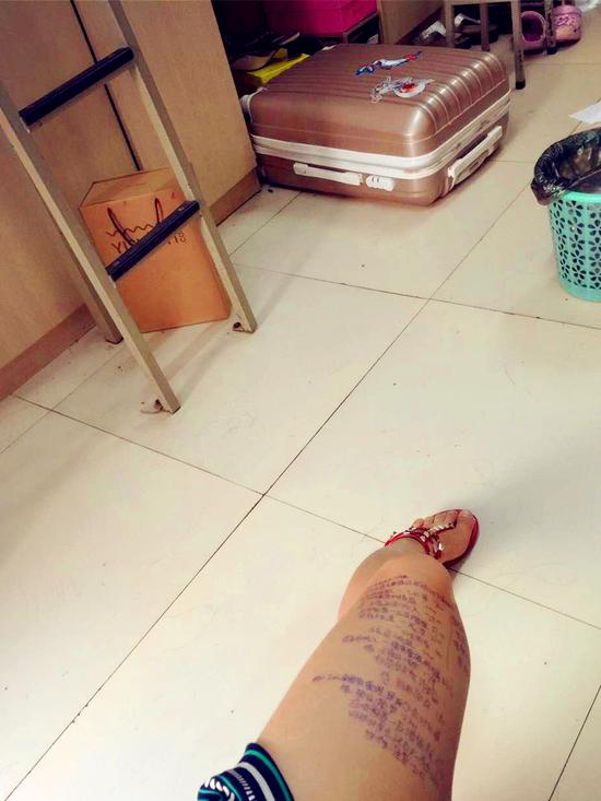 女孩腿上写满小抄自拍留影,这是考前还是考试以后拍的就不知道了,可能只是为了吸引关注吧,不知道内幕。