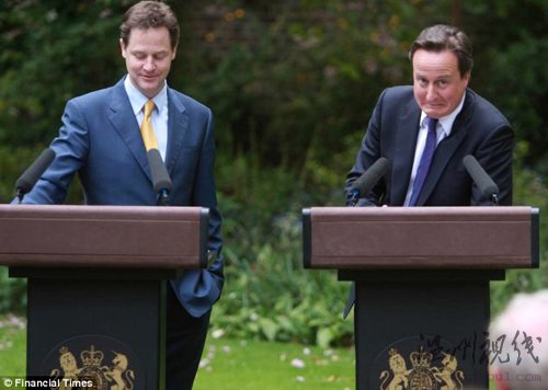 报道称,首相卡梅伦和副首相克莱格肩并肩的站在光影斑驳的唐宁街花园。他们共同分享幽默,数次含义颇深的眼神交流让所有人都认为他们并不是要刻意制造欢乐的气氛。