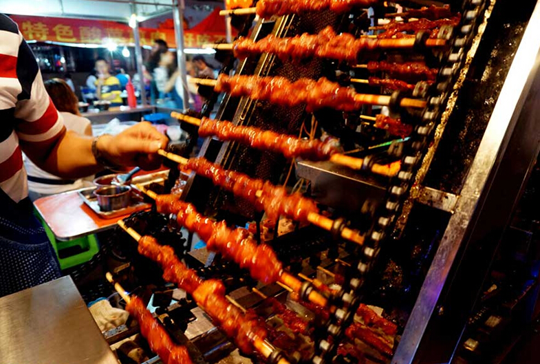 沈阳小贩自制“烤串神机”:2015年8月29日,在沈阳兴顺夜色美食一条街,有一台商贩自制的自动机械烤羊肉串机引吃货围观,这台烤串“神器”的机械原理很简答,通过链条传动,但烤羊肉串小贩能自制这样的装置,也是很不简单了。