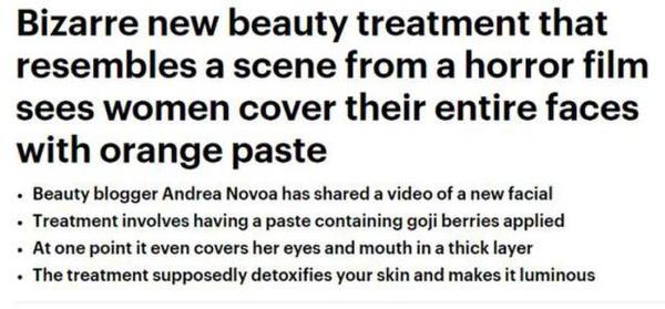 《每日邮报》(Daily Mail)2016年9月7日报道称,一位名为Andrea Novoa的美妆博主,分享了一则视频展示自己美容的新方法,将枸杞做成面膜敷遍自己的全脸。。。。。。据说,这方法可以排毒养颜,还能让皮肤有光泽。