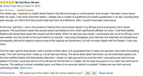 网友Cheryi Faye Terry 的留言光是题目就很唬人,名为“我的枸杞奇迹”(My Goji Berry Miracle)。当然故事也很传奇,大概是说: