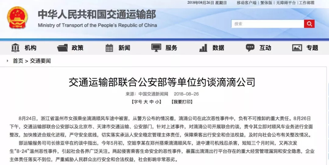 8月24日,浙江省温州市女孩乘坐滴滴顺风车途中被害,从警方公布的情况看,滴滴公司在此次恶性事件中,负有不可推卸的重大责任。8月26日下午,交通运输部联合公安部以及北京市、天津市交通运输、公安部门,针对上述事件,对滴滴公司开展联合约谈,责令其立即对顺风车业务进行全面整改,加快推进合规化进程,严守安全底线,切实落实承运人安全稳定管理主体责任,保障乘客出行安全和合法权益,及时向社会公布有关整改情况。