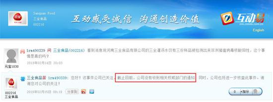 三全水饺检出猪瘟:深交所互动易