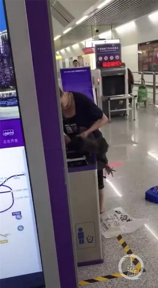大约8秒钟过后,站务人员离开了视频区域,黑衣大妈则开始进行杀鸡。而在视频拍摄过程中,一块电子显示牌下方露出了“CRT重庆轨道交通”的LOGO。
