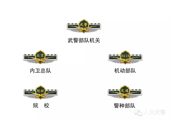 新式姓名牌尺寸、字体与军队一致,底色保留原深橄榄绿色。新式胸标分金属和织唛两款九类,用“武警”、“北京”、“8610(机动部队代号)”、“院校”、“交通”等字样区分单位,胸标中心图案由盾牌和双枪构成,双枪以56式半自动步枪为原型,象征军事属性,左右两侧为长城象形设计,象征武警部队是国家武装力量的组成部分,盾牌是武警部队的特色符号,盾牌下配橄榄枝,寓意和平稳定。