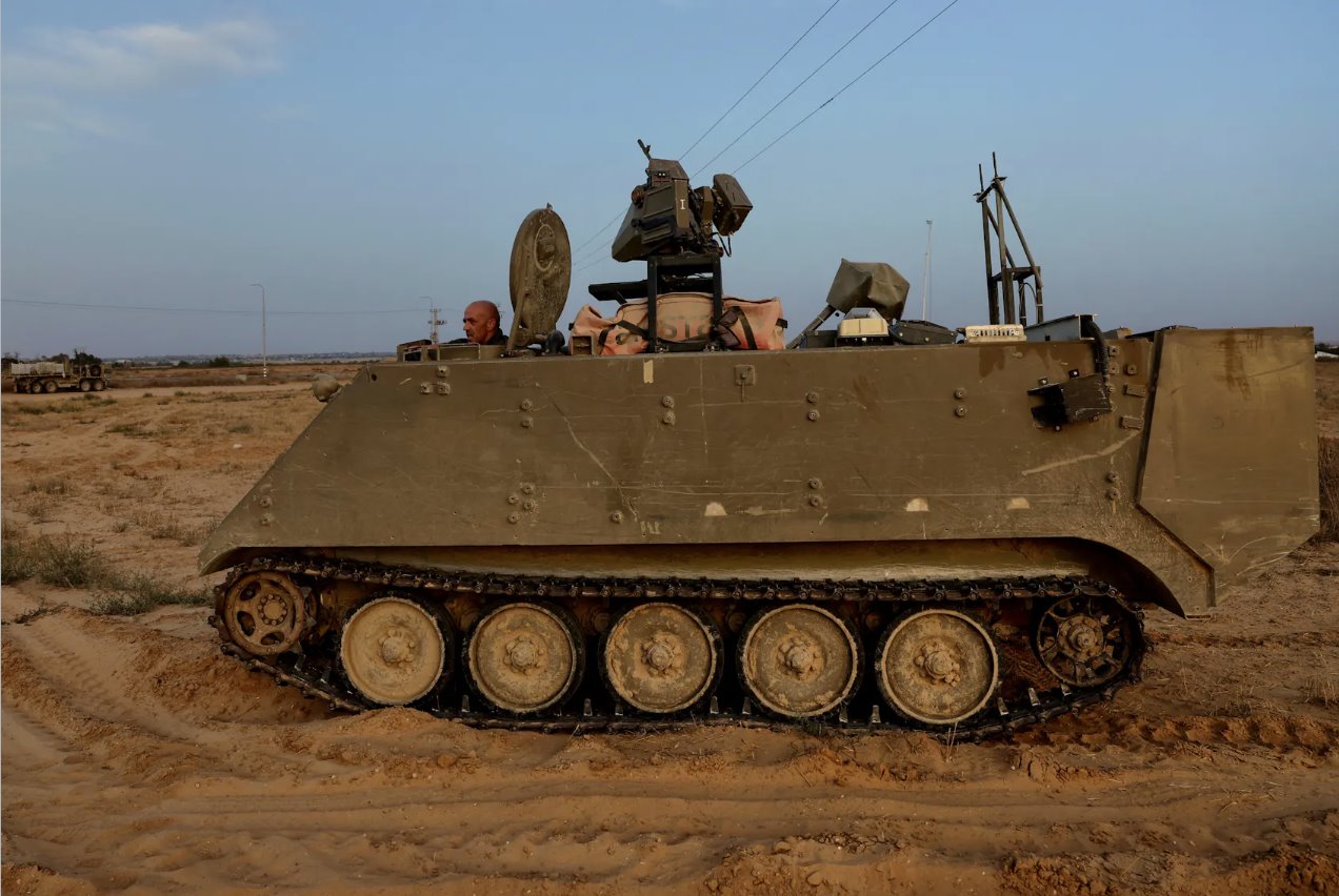 2024年5月17日,以色列凯雷姆沙洛姆郊外的加沙南部城市拉法,军事行动仍在继续,一名以色列士兵驾驶着一辆装甲运兵车。