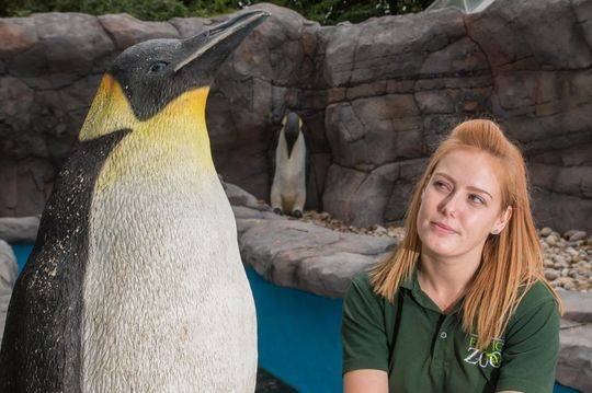 图为28岁的管理员艾玛·霍顿(Emma Horton)与其中一只替身塑料企鹅合影。