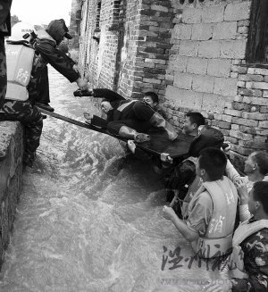 5月14日,救援人员在湖南省江永县上甘棠村转移一位被洪水围困的待产孕妇。 新华社 图