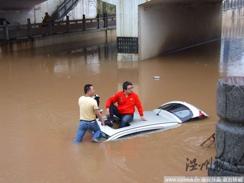 2010年5月13日,江西省出现了今年以来最大范围的暴雨天气,在新余市,历史罕见的降水造成交通要道严重积水。图为被困人员。摄影:云剑 / 东方IC