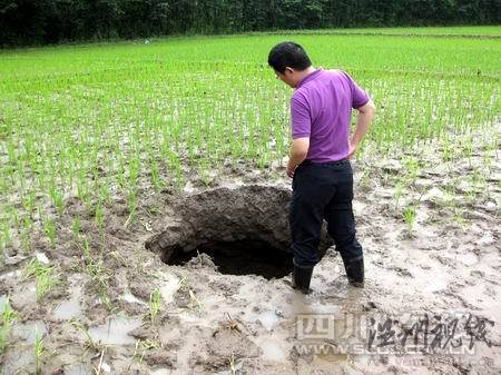 3天后,崇州市怀远镇村民周先生也发现了一个“天坑”。周先生说,他路过邻居家一块秧田时,秧田里突然喷水,势如泉涌。水停后,原本好好的秧田竟出现一个1米多深的“天坑”。
