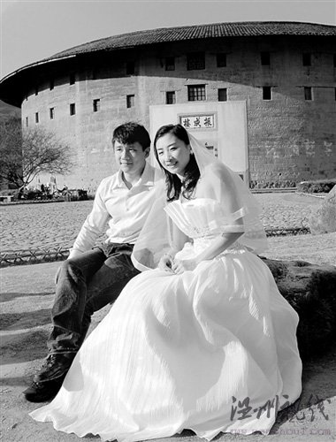 何雯娜还解释了这张“婚纱照”的由来:“那不是婚纱照,因为我是福建土楼的代言人,是当地旅游局的朋友让我们为他的影展拍摄的照片,听说还要拿去参赛,其实不光这一张,还有很多穿运动服拍的照片。”她大方地表示,“婚纱照有时间我们会去拍,肯定会比这个效果要好。”何雯娜介绍:这张照片摄于上月末,她和陈一冰到福建永定县参观访问期间。