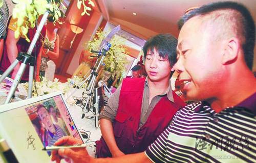 记者随后和赴宴的亲朋好友走进大厅。“您好!请在这里签个名,我们会把你的相貌拍一下,待会据此来抽奖。”婚礼策划公司的工作人员为到来的客人介绍着。“真是太独特了,电子签到都用上了,这还是我第一次见呢。”一位客人说着,把自己的名字签在了上面。