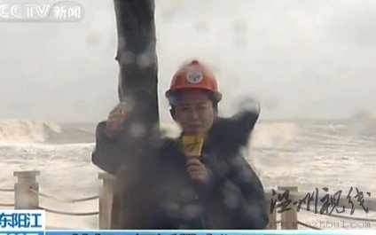 今年第3号热带风暴“灿都”已于21日升级为台风,在广东阳江记者采访的现场,海面大浪已高达十几米,记者无法平稳站立,只好手抱大树进行报道。