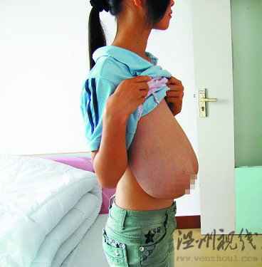 记者在病房看到,小薇穿着一件宽大的外套,瘦弱的体格与其硕大的胸部极不相称,走路时有意识地用手臂托着下垂的双乳,显得有些吃力。