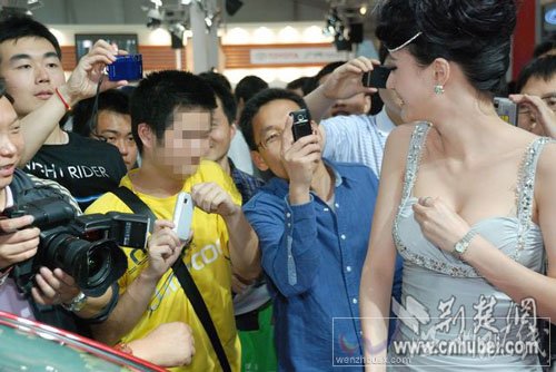 据荆楚网东湖社区网友爆料,5月21日,在武汉国际会展中心举行的2011年第九届华中国际汽车展览会上,数百美女车模吸引了无数参观者的眼球。一个穿黄色T恤的男青年挤在人群最前头,用手机高角度偷拍车模胸部。被车模发现后,多次阻止,但“黄T恤”仍不死心,车模被迫中止了表演。最终“黄T恤”被众摄影爱好者“炮轰”赶走。