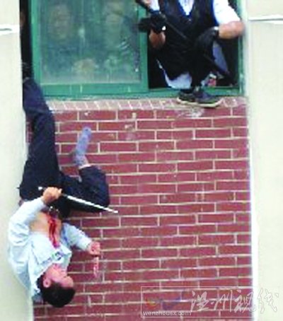 犯罪嫌疑人戴某在现场遗落了一把雨伞,据说警方正是根据雨伞的线索找到了端倪,并最终锁定犯罪嫌疑人正位于离案发地直线距离仅仅500米的栖云苑小区。随后,警方谈判专家以及大批无锡特警全副武装赶赴该小区。戴某迅速窜至5楼楼道,爬上窗台并手持两把尖刀乱舞。双方对峙了有3个小时,楼下不断有人劝说其下来。当地网站的一段视频上记录下了其坠楼的全过程。视频刚开始,只见犯罪嫌疑人拿着两把尖刀坐在五楼的窗台上神情呆滞。随后,画面一转,戴某一只脚被窗台卡住,倒挂在空中,手中的刀依旧在挥舞。戴某还用尖刀划向自己的肚子,顿时鲜血淋漓。11点20分左右,犯罪嫌疑人随着一声“啊”的声音坠下大楼。随后消防员赶到,将犯罪嫌疑人抬出送到无锡第四人民医院后,经抢救无效死亡。