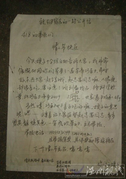 南京大学 5舍418宿舍发现7年前情人节书信,信中提到的赵志富就是这封情人节书信的当事人。那段爱情,现在很美满,那人、那事、那情今犹在,感动网友。一封手写的信件在7年前看起来不足为奇,但在今天这个数码时代就显得难能可贵。在昨天的南京大学小百合论坛上就爆出了这样一封七年前情人节的信,而且7年来,这封信一直贴在南大5舍418的宿舍里。信件出自一位女生的手笔,她直爽的要求“418宿舍的弟兄”监督自己爱人的“风吹草动”。娟秀而不失硬朗的笔迹和情意绵绵话语让不少南大学生感慨,“这样的感情真是幸福的一塌糊涂。现在还有谁会亲笔写信呢?”