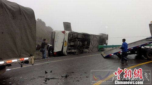 9月17日13时50分,四川松潘县黄龙雪山梁处发生一起特大交通事故,一辆从九寨沟开往黄龙方向,车牌号为川U18907的九寨运业旅游公司客车行驶至雪山梁下行4公里处时侧翻于公路边,导致7人死亡。中新社发 松潘县川主寺交警队 摄