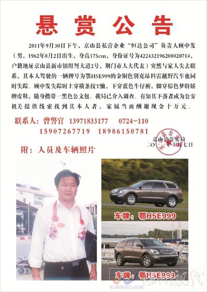 京山亿万富翁顾中发失踪遗体找到,警方确认顾中发身份展开追捕凶手。监利县公安局抓获一名嫌疑人熊某。