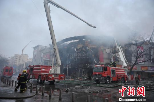 2月27日郑州大火,消防部门启用大型救火设备扑火