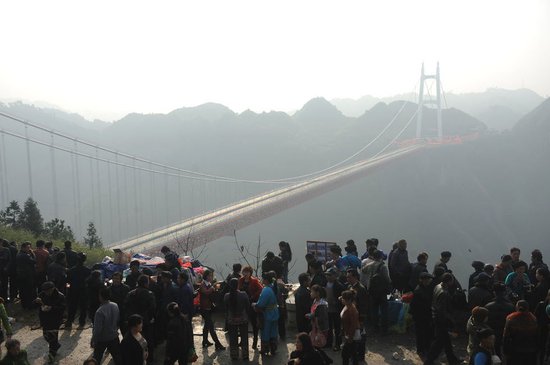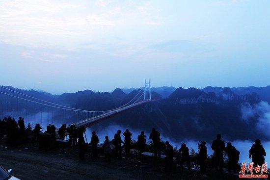 湘西矮寨特大悬索桥今日通车,天刚破晓,一群市民和摄影爱好者就前来观看盛况。