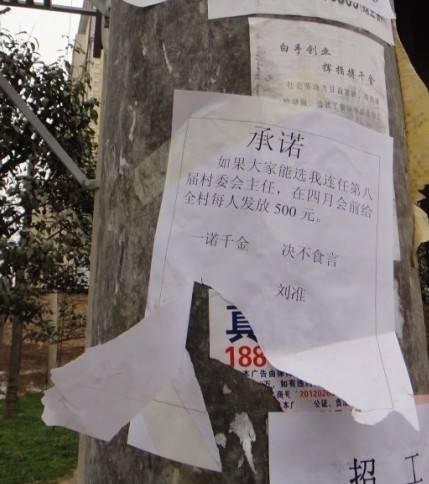 正在大家忙着按照程序准备进行选举时,却有人惊奇地发现,村里的电线杆上、人家门缝里都出现了一张白纸,上书“承诺”:“如果大家能选我连任第八届村委会主任,在四月会前给全村每人发放500元,一诺千金,决不食言”,落款为“刘准”。