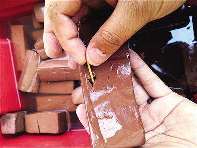 记者从水池内捞起一小块所谓的“鸭血豆腐”,其外表光滑鲜亮,摸起来柔嫩,掰开后,血豆腐内呈现许多不规则的小气孔。而大块的“猪血豆腐”,颜色较暗,摸起来略显坚实,里面的气孔较大。