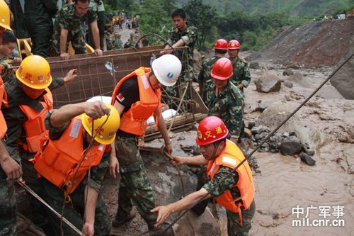 接到灾情通知后,驻守电站施工区的武警交通五支队迅速启动防汛应急救援预案,紧急出动兵力116余人,携带指挥车、装载机、挖掘机、自卸车等大型设备28台套,撬杠、安全绳、强力剪等便携式抢险工具60余件和担架、雨衣、救援药品等救援物资20分钟就赶到现场,展开抢险救援。