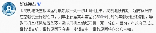 2013年1月8日上午,昆明发生地铁脱轨事故,幸好是空载试运行,地铁上没有乘客,只有司机。昆明地铁首期工程南段列车在空载试运行过程中,列车上行至离斗南站约500米段时列车部分设施脱轨,导致司机室暖风装置坠落,造成司机室值班司机一死一轻伤。