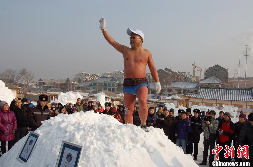 2013年1月13日上午,在延吉阿里郎冰雪节上,“世界冰王”金松浩表演耐寒绝技,令围观者惊叹不已。金松浩不仅埋在齐腰深的雪坑中作画、唱歌,零下18℃的环境在冰面上用60桶冰水冲浴。“世界冰王”金松浩极强的抗寒能力,真是奇人呀!