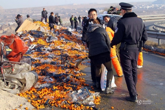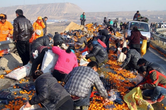 兰州哄抢桔子:村民哄抢翻车货物又现兰州,2014年1月4日,兰州青兰高速公路柳沟河收费站附近一辆货车侧翻,满车桔子撒落,上百名村民哄抢桔子,在哄抢人群里还有小学生。