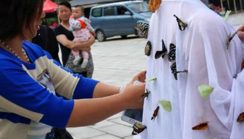 扎死蝴蝶装扮仙子媒体报道后,有市民到景区为死去的蝴蝶讨公道。