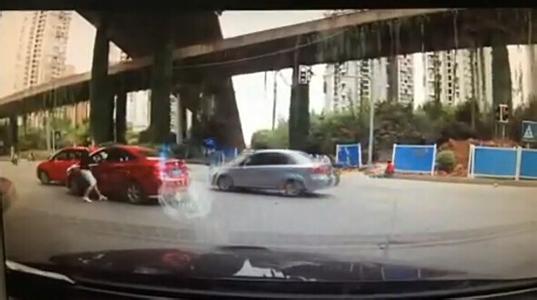 时间是下午2点13分,男子的开的红色polo轿车将一辆红色现代轿车逼停的成都娇子立交下,男子从车上下来后,冲到现代轿车的驾驶室旁边,伸手就和车内女子发生拉扯。