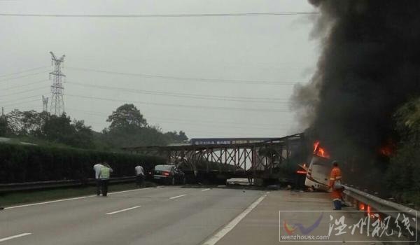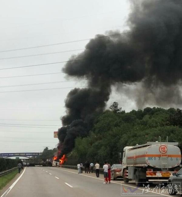 据悉,车祸发生的位置在潭邵高速公路1075公里处,当时一辆广西牌照的大货车从左车道撞到右车道。一辆正常行驶的大客车被货车撞在路边,事故后大客车立即发生了起火。此外现场还有两辆车与大货车发生相撞,事故发生后潭邵高速交警和消防救援人员立即赶到现场展开救援工作。