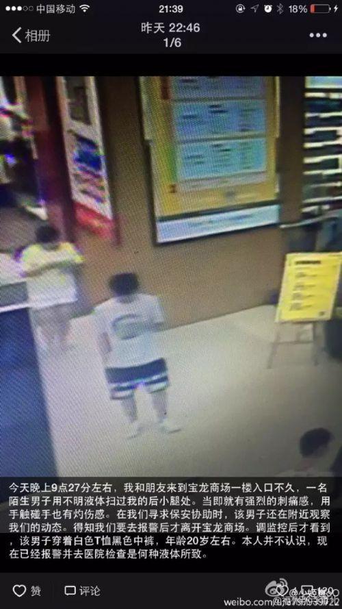 7月3日,网友@小姬崽微博爆料,6月29日晚上9点27分左右,在宝龙城市广场1楼入口处,一名陌生男子将不明液体洒在她小腿上,她当即被灼伤。受害女孩描述当时的情况:“当即有强烈的刺痛感,用手碰触也有灼伤感,在寻求商场保安协助的时候,一名男子还在附近观察我们的动态,得知我们要去报警之后才离开了宝龙城市广场。我们在调取监控后才看到,这名男子穿着白色的T恤黑色的中裤,20岁左右。”