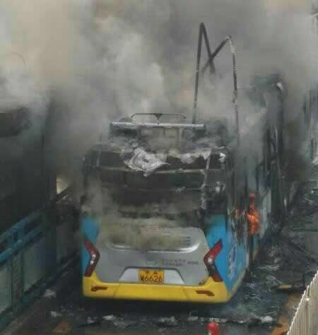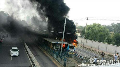 据目击者描述,是一辆停在站台的公交车起火了。整个车都着起来了,还顺带着烧到了站台。车上并没有乘客,应该是都疏散了。